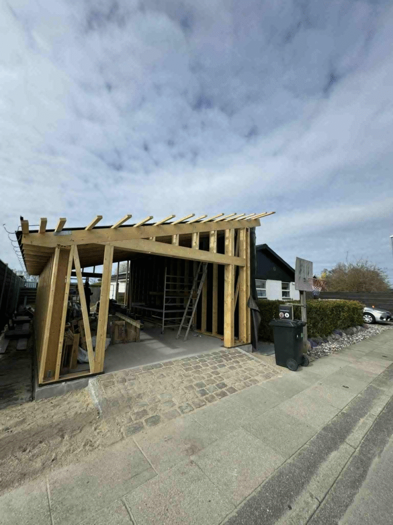 På Amager ønskede en familie en ny garage, og vi fik fornøjelsen af at hjælpe dem godt i gang med projektet. Vi sørgede for en solid start ved hurtigt at rejse stolper og spær samt montere et holdbart tag med eternitplader. Herefter stod konstruktionen klar til, at familien selv kunne fuldføre beklædningen i bedste gør-det-selv-stil.